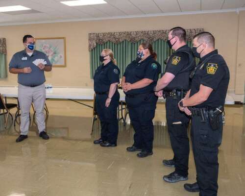Kyle Albrecht, LVHN, presented “Baby Delivery” pins to paramedic Anne Boddie and EMT Kayla Keller, Northern Valley EMS Inc. and officers William Borst and Christopher D'Andre of the Slatington Police Department. LOU WHEELAND/SPECIAL TO THE TIMES NEWS